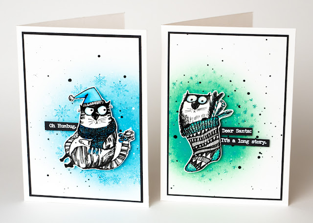 Tämän joulun pakettikortitkin tehtiin tietysti kissaleimasimilla. Leimasin katit suoraan manillakartongista tekemilleni tägeille Memento-musteella, osittaisväritin Copiceilla ja musteutin reunat Distress Oxide -musteilla, joita sipaisin myös tulostamiini teksteihin. Roiskin myös vähän vettä reunoille. Saajan nimen voi kirjoittaa tekstin alle.
