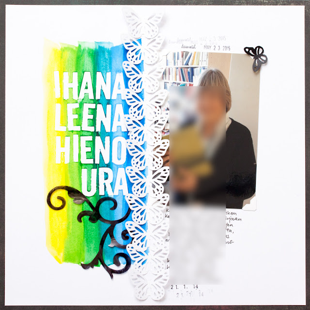 Ja samat raidat leiskassa - tein ensin otsikon Amy Tangerinen litteillä kirjaintarroilla ja poistin tarrat värien kuivuttua. Kirjaintarraresist siis.